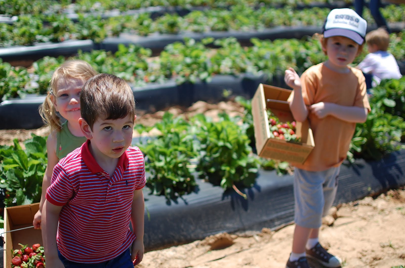 last week our playgroup from church went to pick strawberries at a farm in arlington called gnismer farms. it was SUCH a fun activity for the kids - they loved it! i didn't realize this until we went but strawberries are the perfect thing for kids jayden's age to pick because they are low to the ground and it seems pretty easy to tell which ones are good or not (basically you want the bright red ones and not the green ones!). it took j a little time to get the hang of the "type" of strawberry to get - but he got it. as one mom said - jayden was more into "quanity" than "quality!"